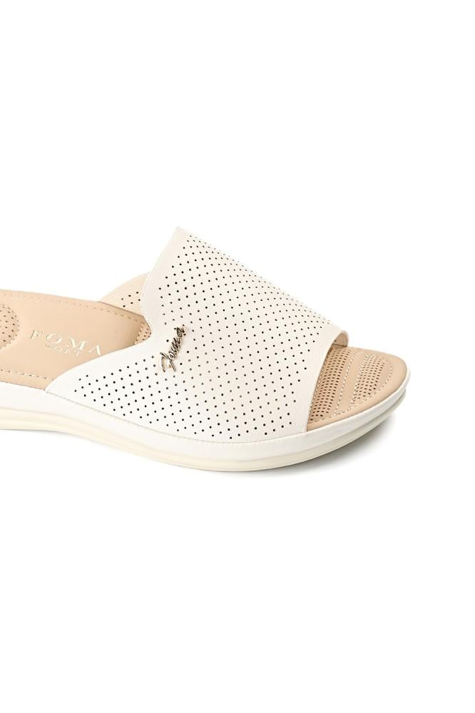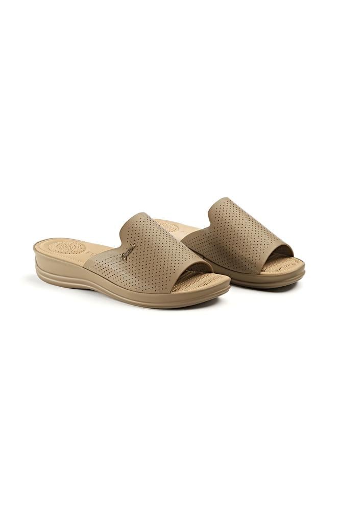 صندل نسائي بكعب إسفين (Wedge Slide) بنظام Slip-On، مفتوح من الأمام مع شريط علوي واحد عريض.