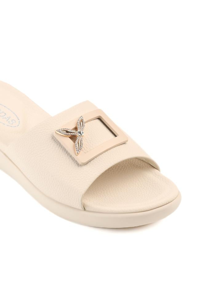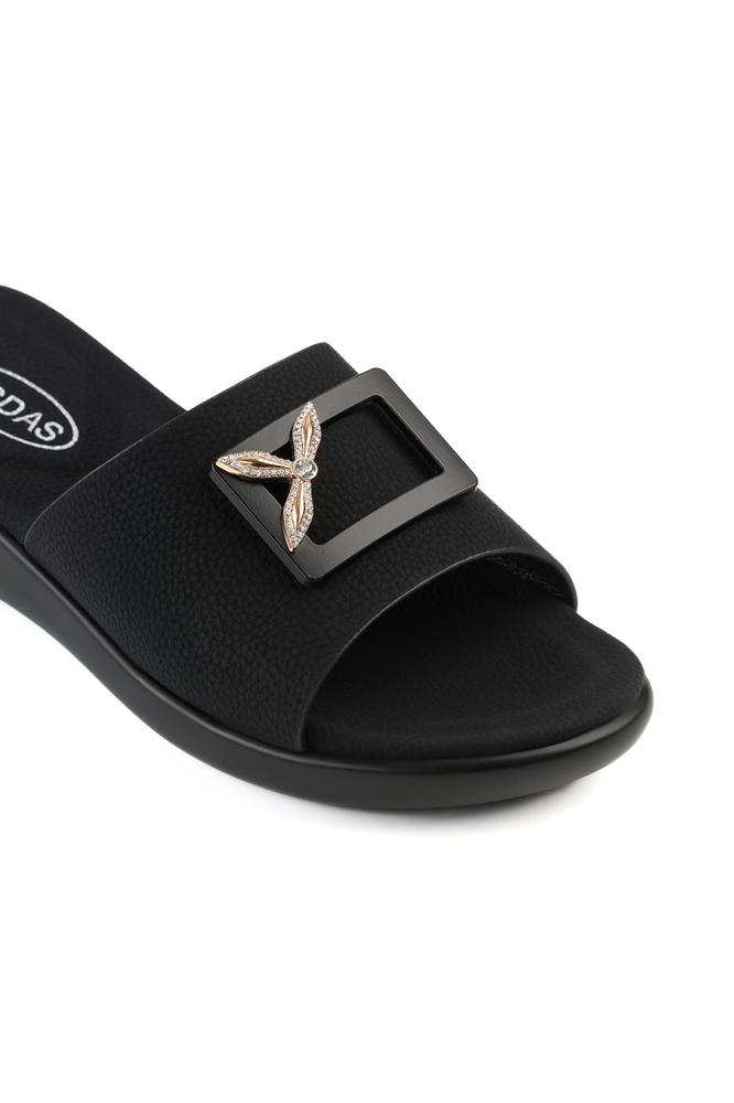 - يتميز التصميم بشرائط عريضة تحتوي على قطعة مرصعة بالستراس على شكل هندسي تمنحه طابعًا عصريًا وتهوية ممتازة.