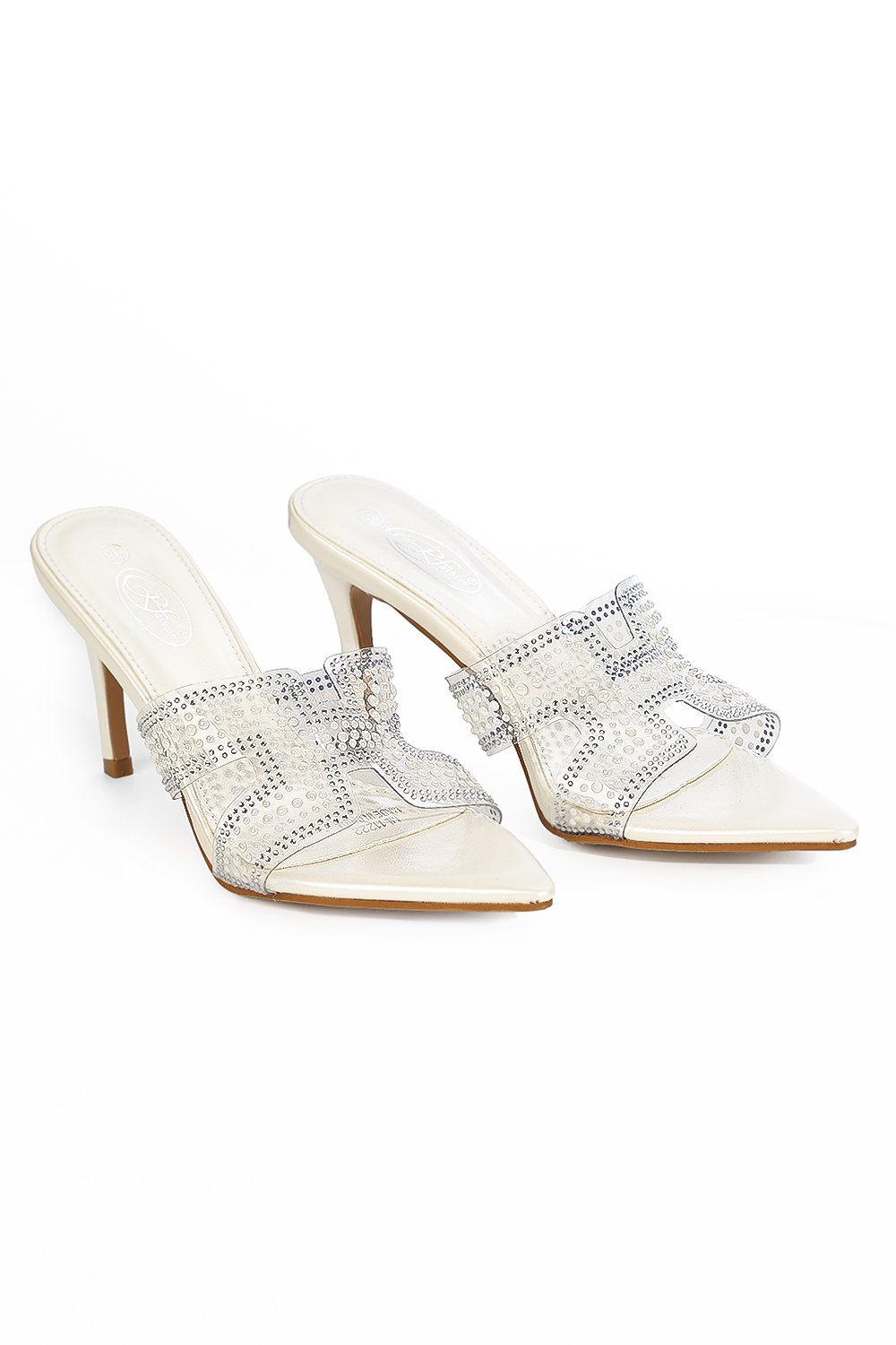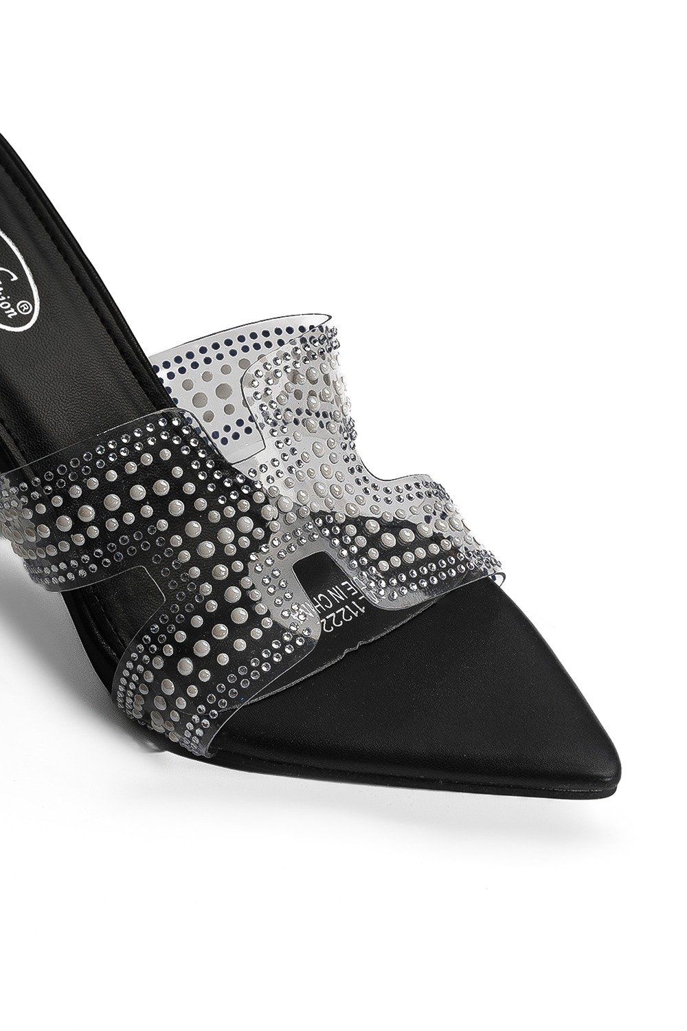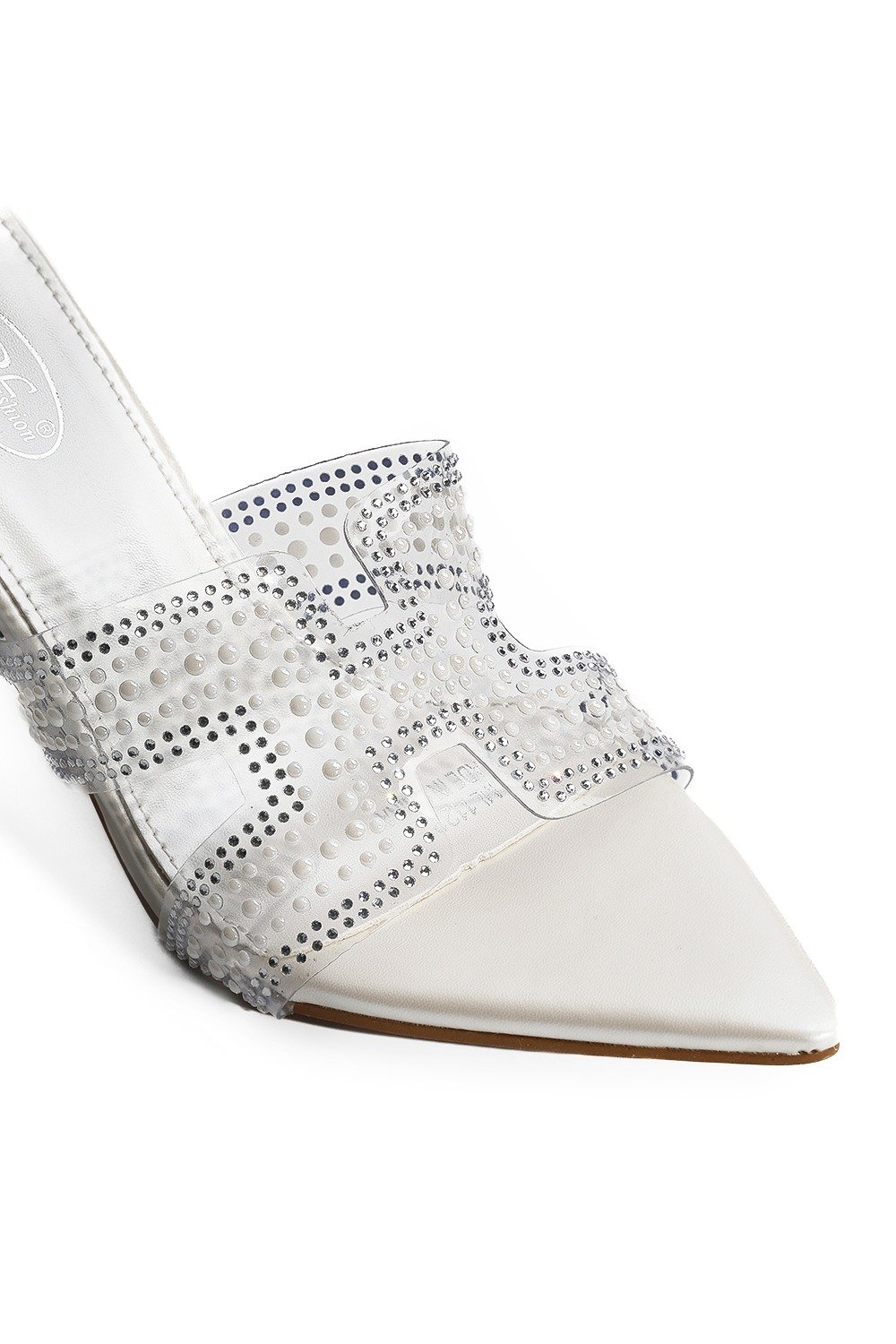 حذاء كلاسيكي مفتوح بمقدمة شفافة عريضة مزينة باللؤلؤ وكعب عالِ رفيع