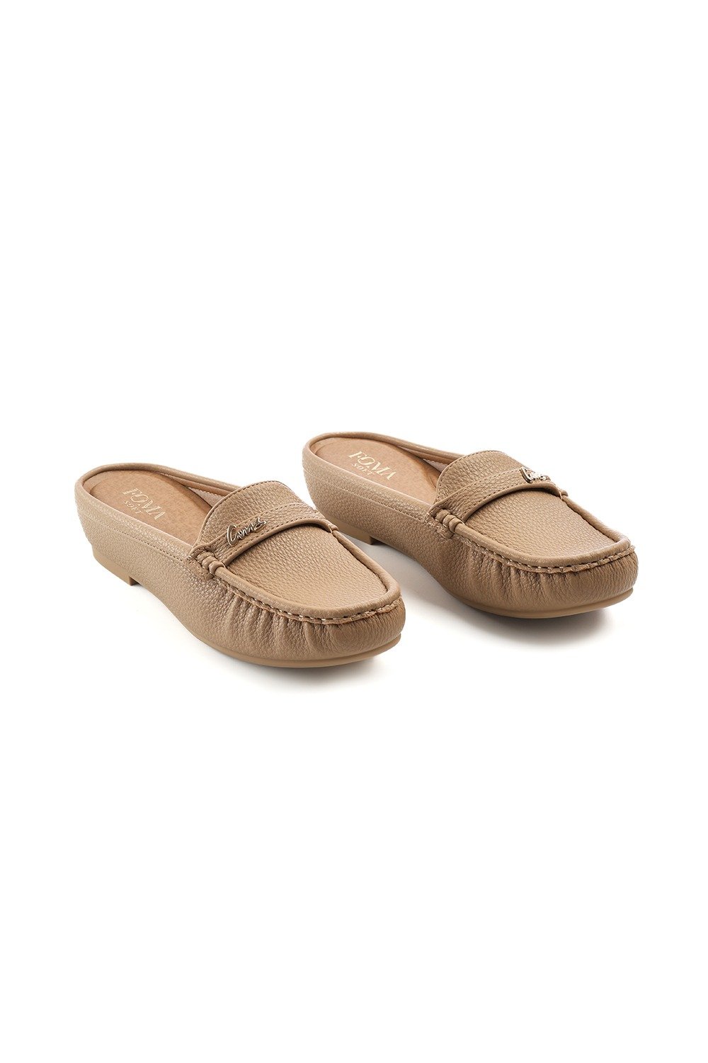 حذاء فلات طبي نسائي مفتوح من الخلف مزود بشريط جلدي مزين بقطعة معدنية على الجانب