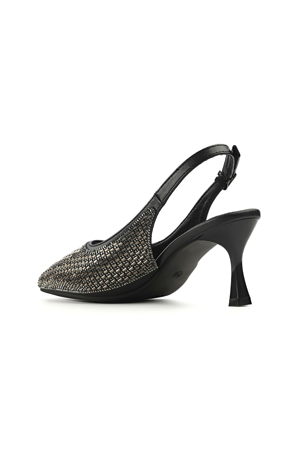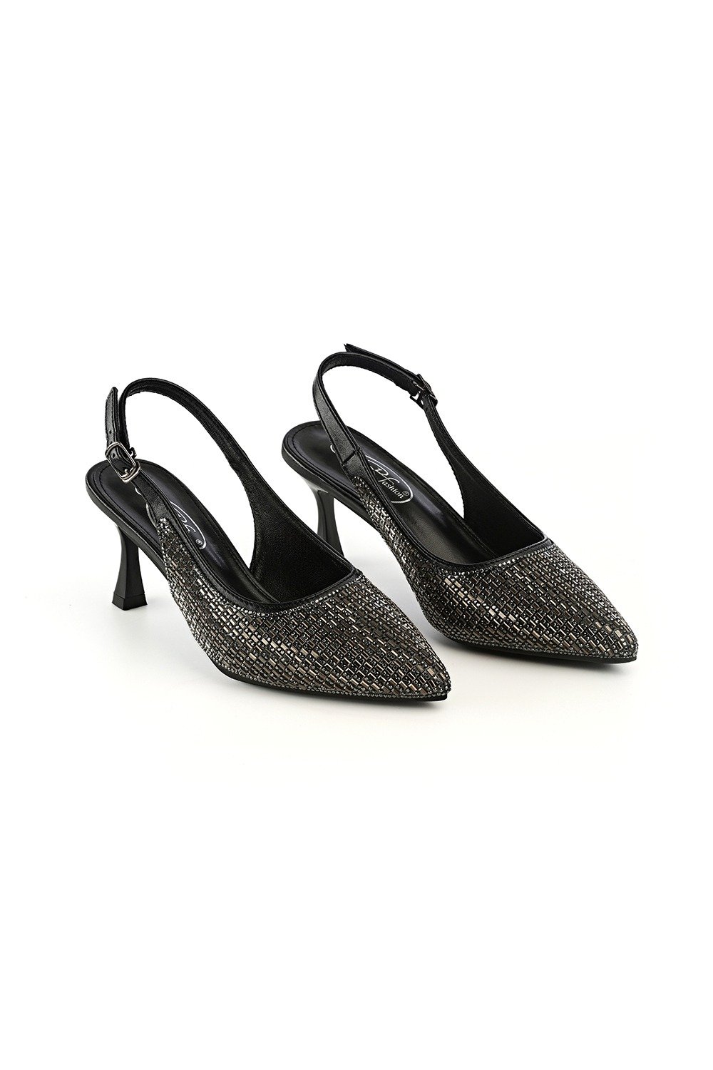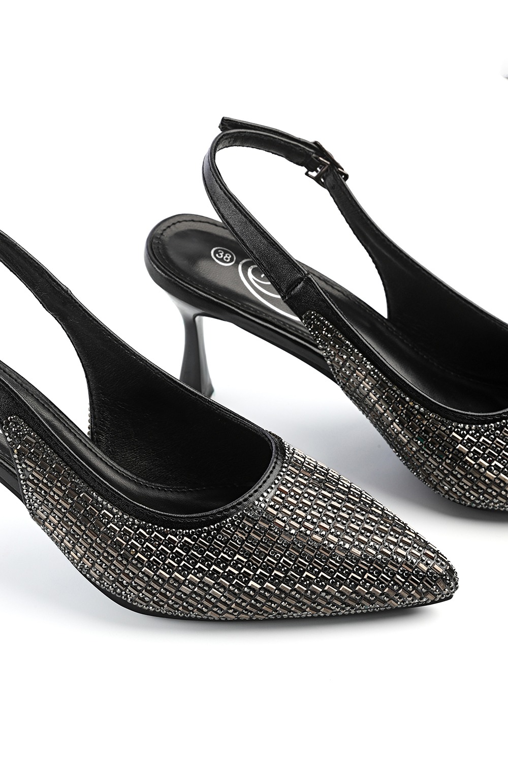 حذاء كلاسيكي سهرة أنيق بمقدمة مدببة مرصعة بأحجار لامعة وكعب عالِ رفيع و إبزيم إغلاق