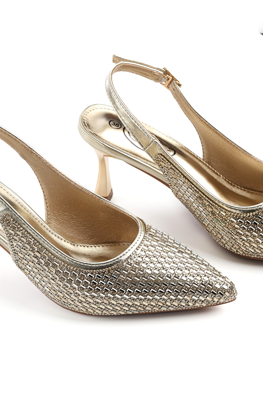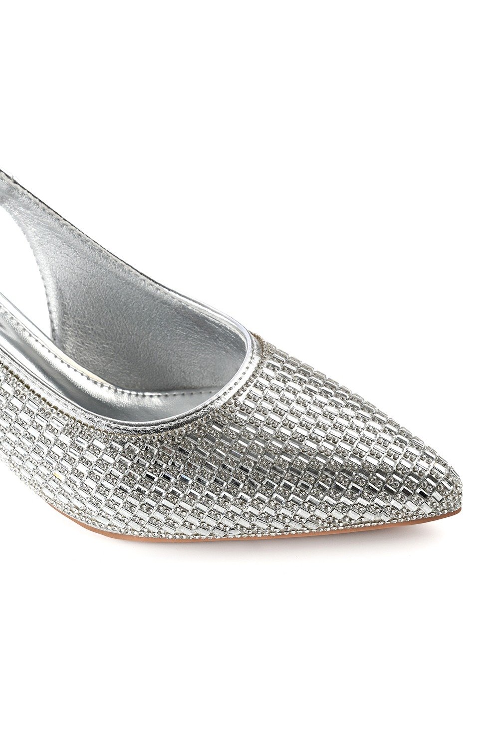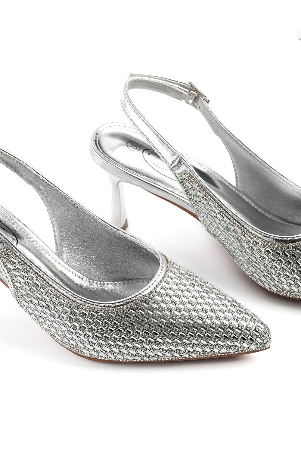 حذاء كلاسيكي سهرة أنيق بمقدمة مدببة مرصعة بأحجار لامعة وكعب عالِ رفيع و إبزيم إغلاق