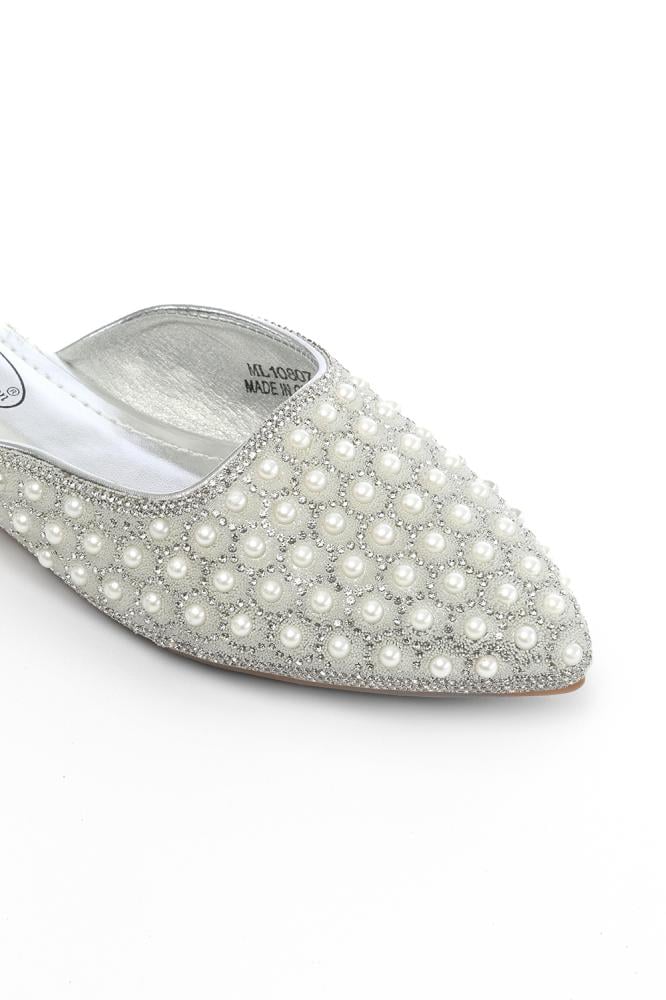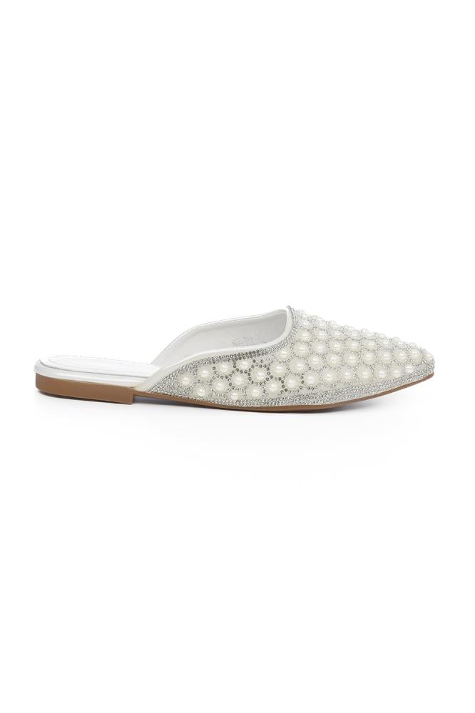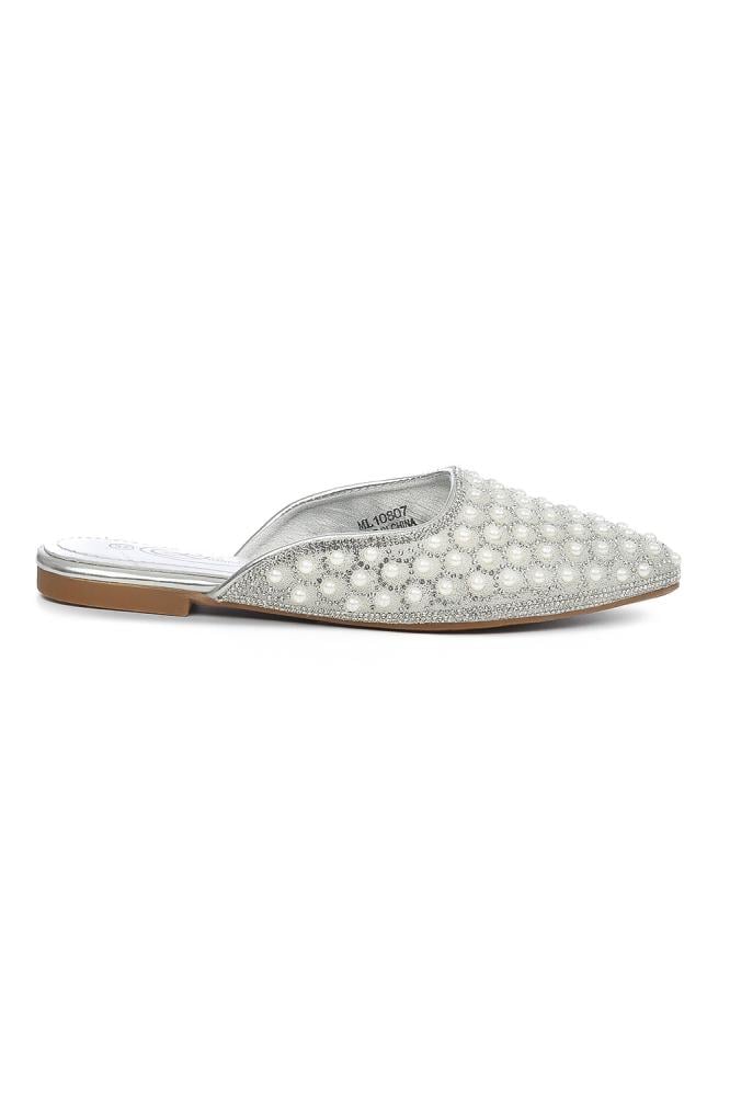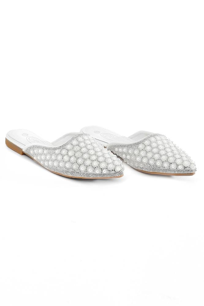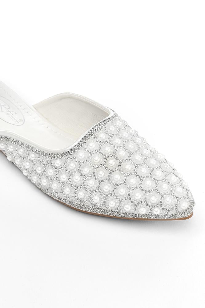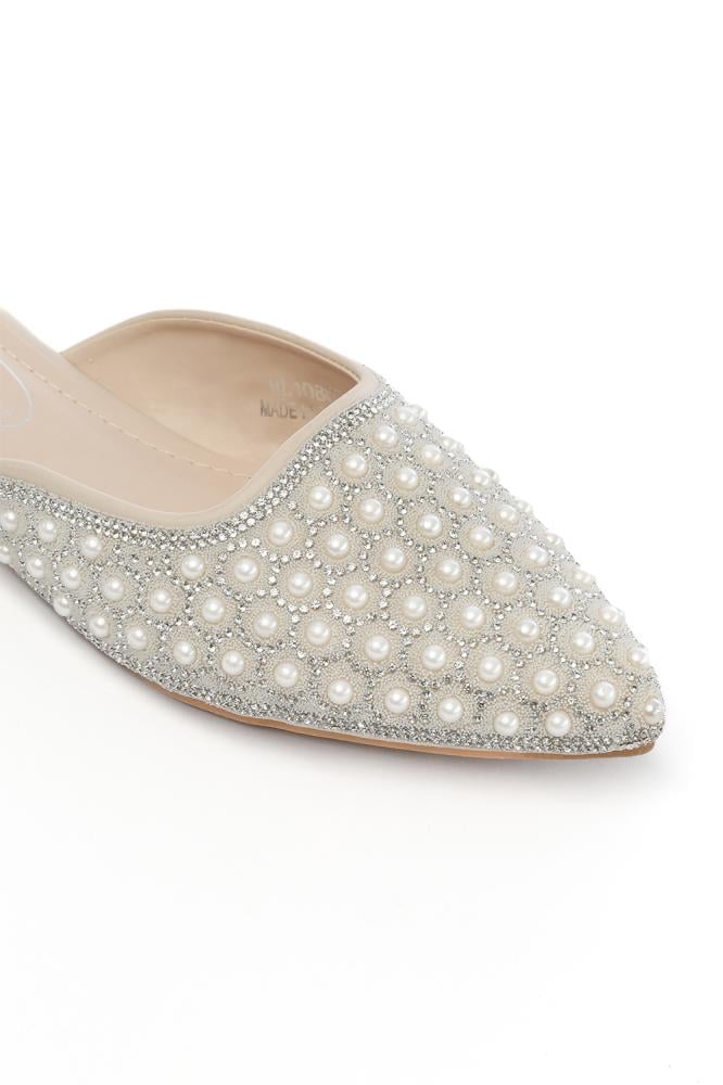حذاء نسائي مفتوح بتصميم أنيق يُعتبر خيارًا مثاليًّا للمناسبات الرسمية أو السهرات بفضل الزخارف اللؤلؤية اللامعة، مع إمكانية دمجه مع إطلالات يومية أنيقة بسبب لونه المحايد.