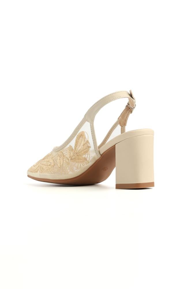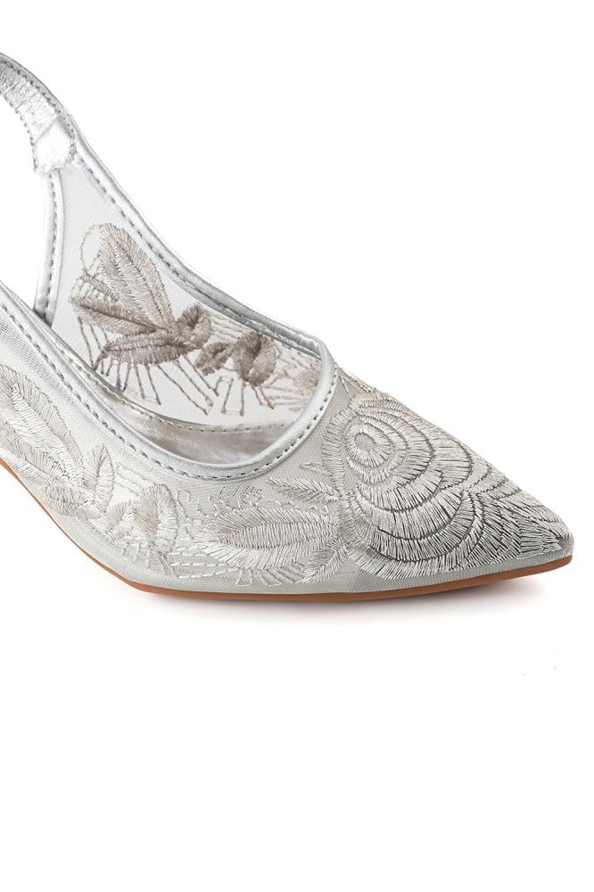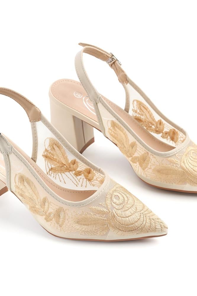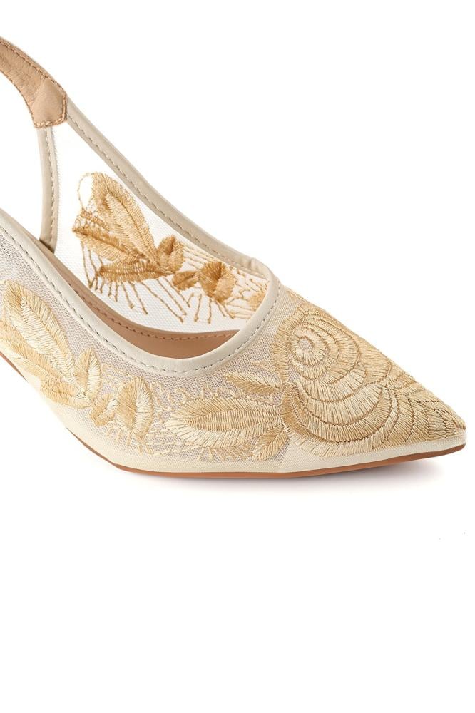 - تطريز يدوي متقن يغطي مقدمة الحذاء بتصميم متداخل