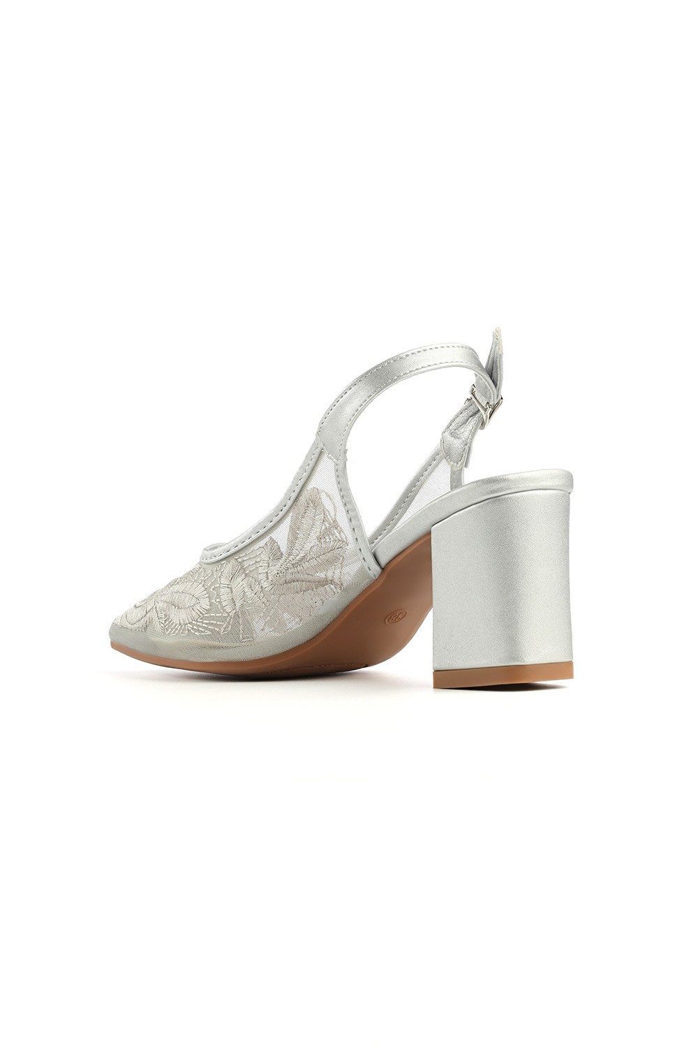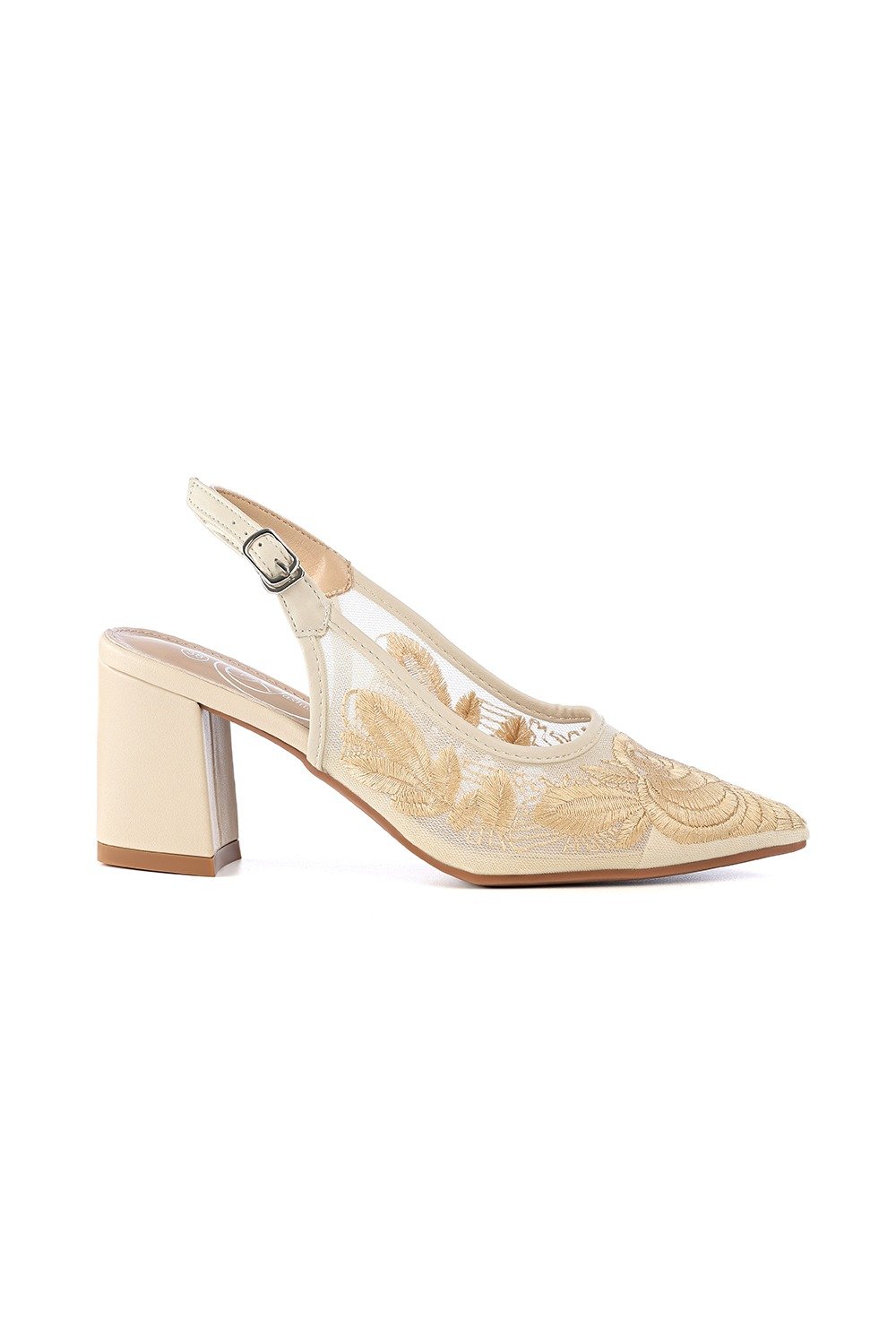 حذاء كلاسيكي سهرة أنيق بمقدمة مدببة مصنوعة من شبكة مطرزة بكعب كتلة و إبزيم إغلاق