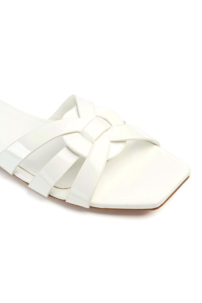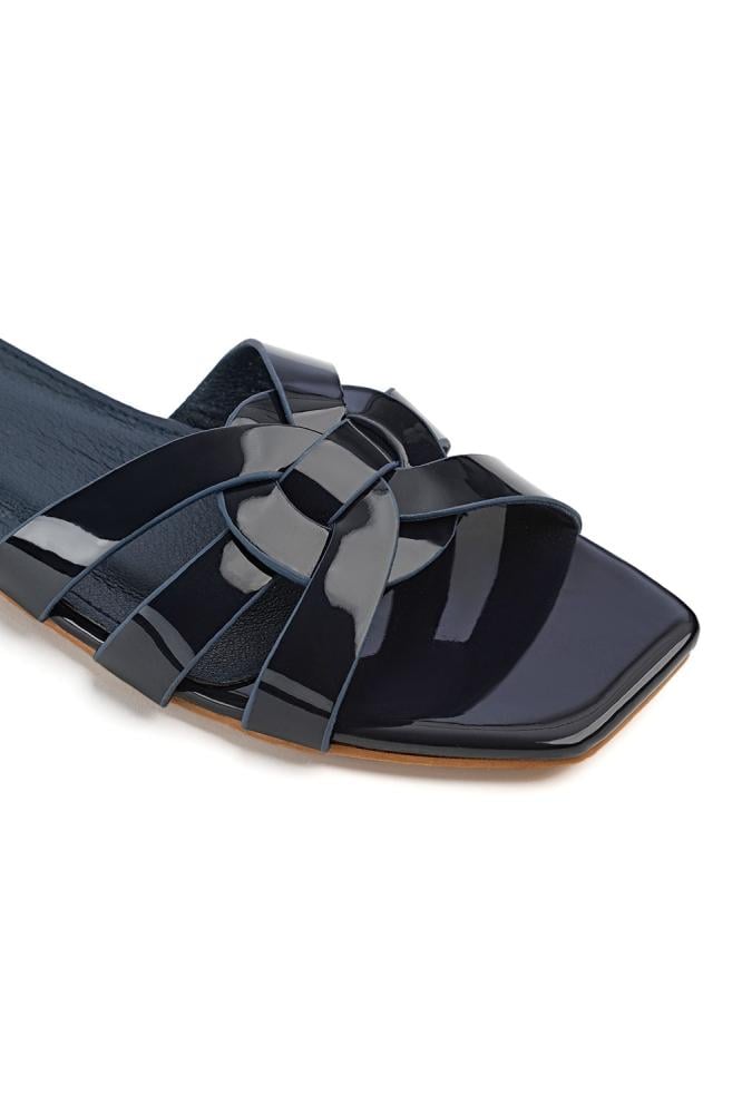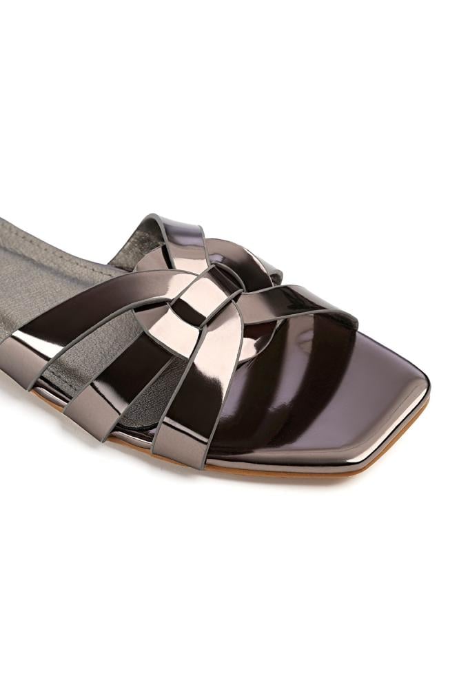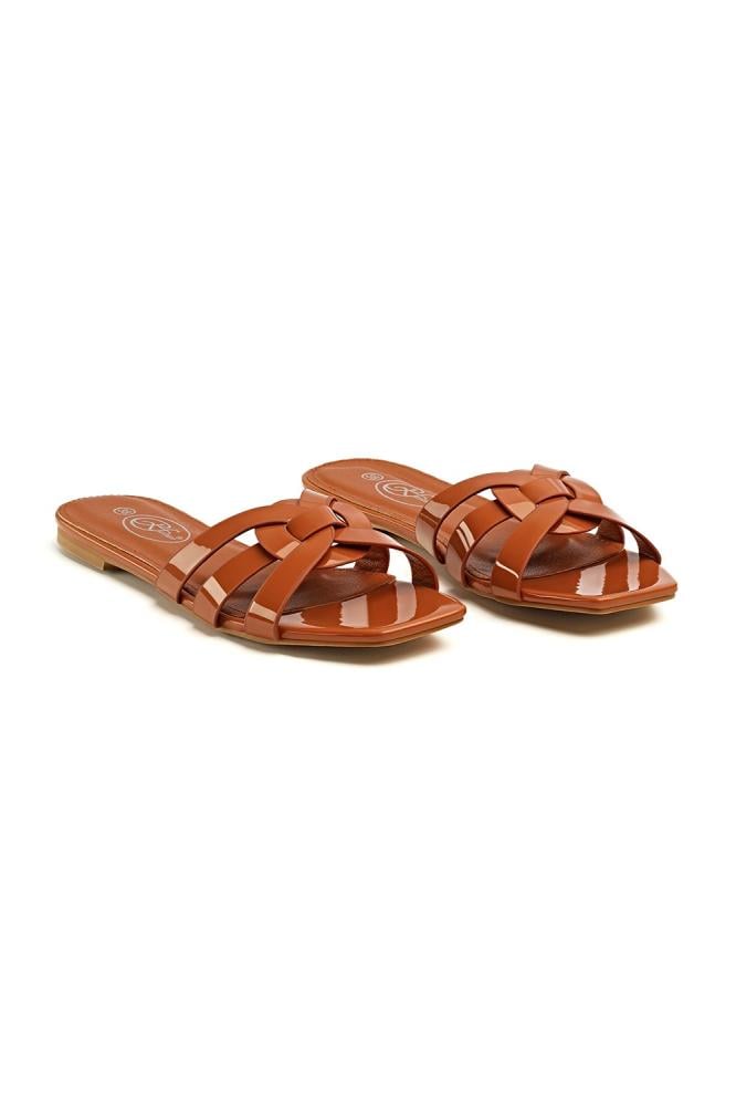 الصندل مصنوع من جلد صناعي لامع يمنحه مظهرًا أنيقًا وسهل التنظيف. الأشرطة ناعمة ومرنة، بينما النعل مصنوع من مادة ماتة مضادة للانزلاق توفر ثباتًا أثناء المشي.