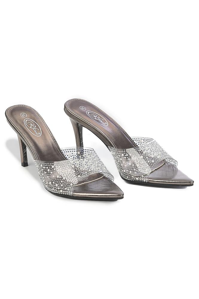 صندل نسائي بكعب متوسط الارتفاع يتميز بتصميم عصري براق يجمع بين الإطلالة الفاخرة واللمسات الجذابة.